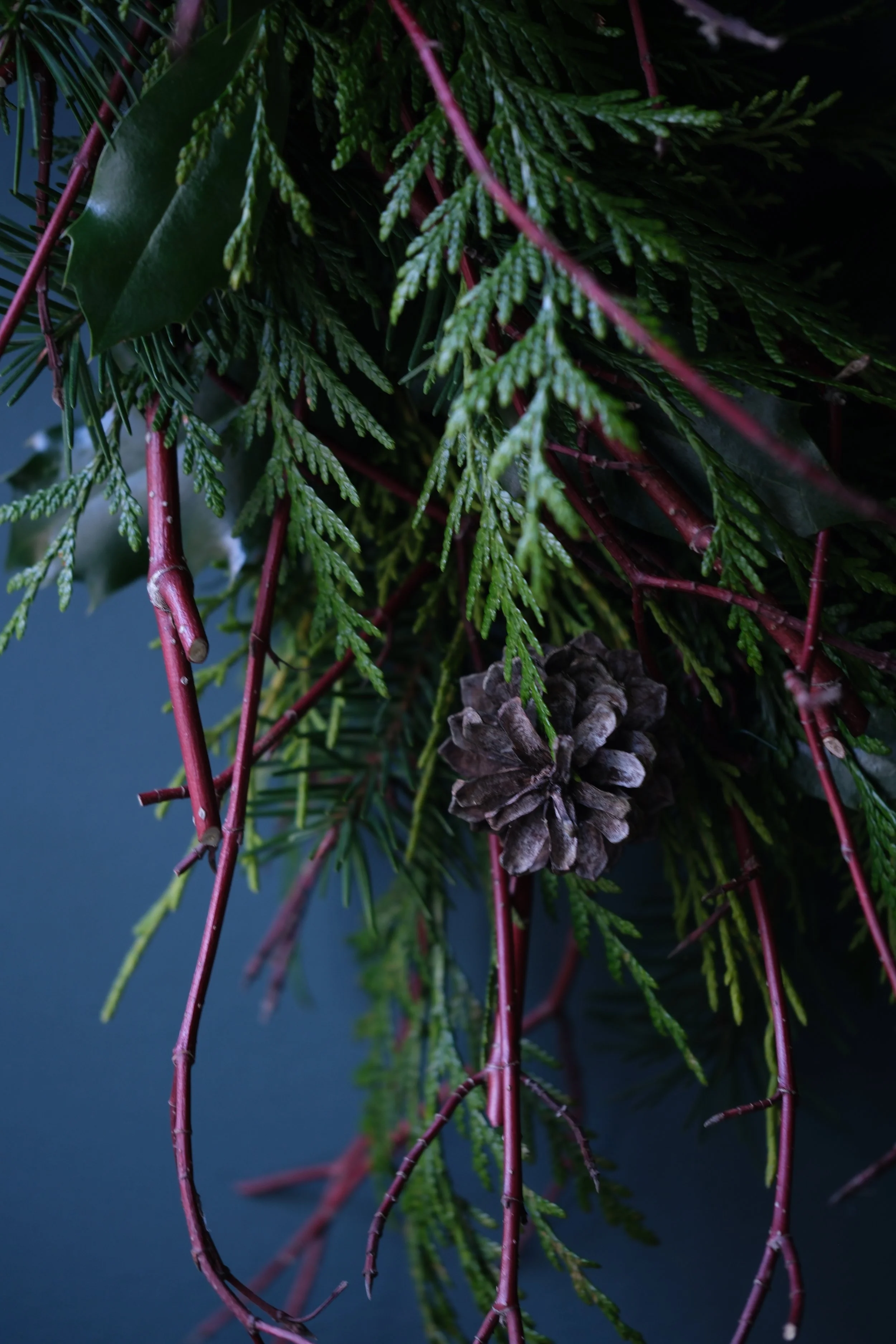 With a plethora of different foliage and the striking highlights of red dogwood branches, English holly, and pinecones, this is a stunning wreath for the holidays.